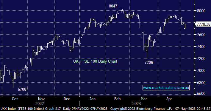 • No change, the UK FTSE looks set to test the 8000 area in the coming months i.e. only 3% away from Friday’s close.