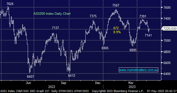 The ASX200 reacted badly to the “surprise” RBA rate hike but after a rapid 250-point drop buyers returned albeit in very specific pockets of the market e.g. ESG and gold names. The markets experienced a rollercoaster ride of sentiment over the last 2-year yet the markets remained largely range bound between 6500 and 7600, in this case we believe it’s a case of if it’s not broken don’t fix it i.e. de-risk in the 7400-7600 area and increase market exposure/risk below 6750.