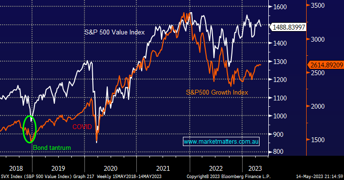 Recession fears continue to exert a huge influence over markets with bond yields targeting central bank pivots in the near future, year to date we’ve witnessed stocks that like a strong economy and higher rates struggle from a relative perspective e.g. Westpac (WBC) –9.7%, Woodside (WDS) -5% and BHP Group (BHP) -4.7% compared to Wisetech (WTC) +39.8%, Xero (XRO) +33.5%, and REA Group (REA) +25.5% i.e. 2023 has been dominated by growth stocks after the first 4 ½ months.