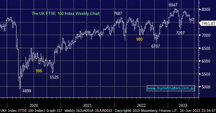 The tech based NASDAQ has retreated marginally from its 2023 highs but it’s hardly a speedbump compared to the decline by the ASX into the weekend. While heavyweights such as Microsoft and Apple Inc continue to make fresh all-time highs we believe it’s a very dangerous game to call the US growth stocks lower i.e. far better risk/reward is delivered by buying pullbacks with the bullish trend.