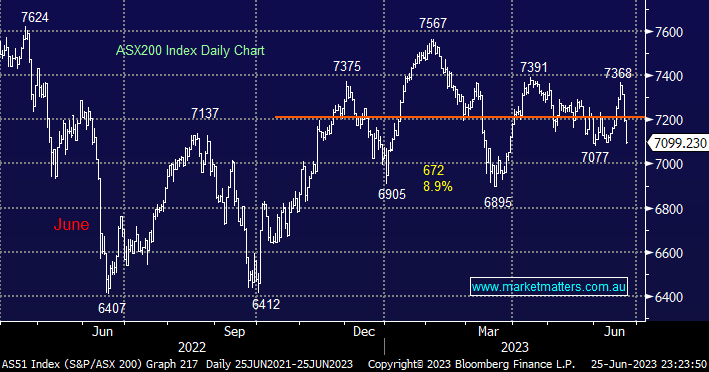 The ASX200 was sold off aggressively last week and we believe there’s a strong possibility that the selling could follow through over the coming weeks – if we look at the move in June 2022 the decline may have only just begun! Just because stocks fell last June is not a reason for MM to adopt a selling approach to stocks but when combined with the weakening economic data that’s surfaced over recent weeks it does combine to make us adopt a cautious short-term approach.
