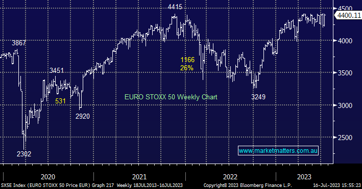 Not surprisingly European stocks joined in the “Global Party” all courtesy of one slight beat by US CPI i.e. as we said too many people were positioned the wrong way! We see no reason not to adopt a positive bias toward the EURO STOXX 50 but the risk/reward isn’t very exciting around the 4400 area.