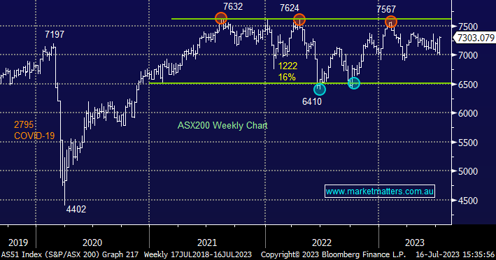 The ASX200 surged +4.5% from last Mondays low as defensively positioned investors appeared to press multiple buy buttons after the US CPI print, standout gains were made by the Tech, Materials, Real Estate and Energy Sectors although with the exception of the Healthcare Sector all pockets of the market contributed to the markets best performance in 9-months. As bond yields turn lower a period of “risk on” looks likely to unfold i.e. the sectors that have outperformed as yields rose through April, May and June are likely to take a backseat while yields retreat.