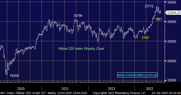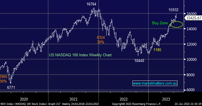 The broad based US S&P500 closed marginally higher last week whereas the tech stocks slipped over -3% from their intra-week high following softer than expected results from Netflix (NFLX US)) and Tesla (TSLA US) i.e. you must deliver if you are priced for growth which was highlighted by TSLA and NFLX who both tumbled well over -10% from their recent highs. If we are correct the next few weeks should see tech names continue to slip lower however in our opinion the best risk/reward will be delivered by buying this correction.