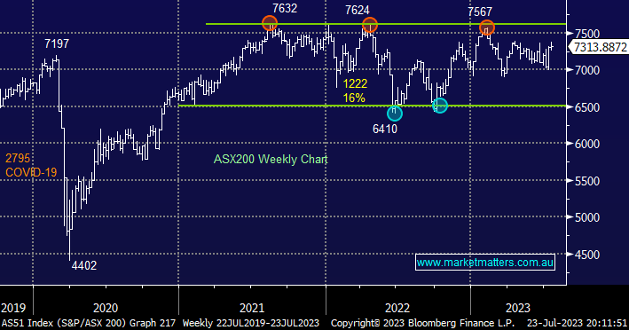 The ASX200 index trod water last week whereas the action on the sector level was far more interesting with the Financials advancing +2.7% while the Materials index closed down -2.5%. With interest rates expected to be lifted higher this week and China remaining schtum with regard to stimulus, it’s hard to envisage the influential Resources Sector finding any love as we rapidly approach August but as we’ve said a few times recently markets form lows when they look their worst.
