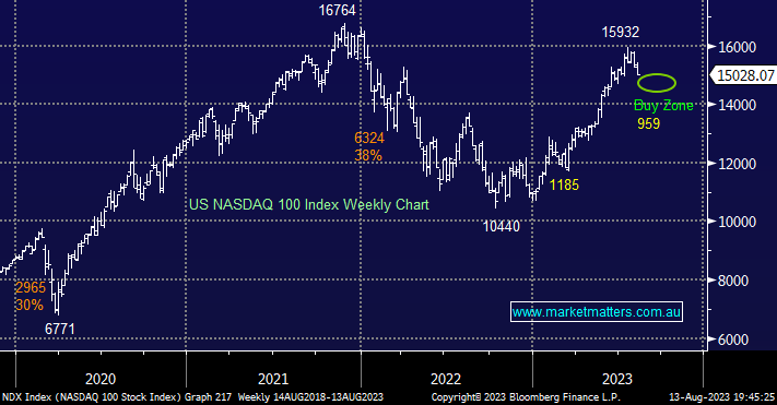 US indices extended their August pullback last week with the tech based NASDAQ now down -4.6% month-to-date however we see no reason to panic, it’s both hardly a dent in the advance through 2023 and exactly what we’ve been targeting of late – followed by a buying opportunity. Not surprisingly it’s the “Magnificent Seven” tech stocks that have boomed this year that are experiencing most of the selling with the NYSE FAANG+ Index down -9.7% already, almost an official correction.