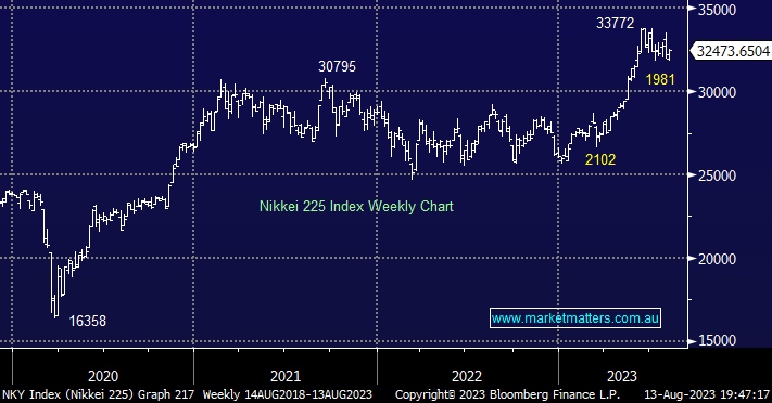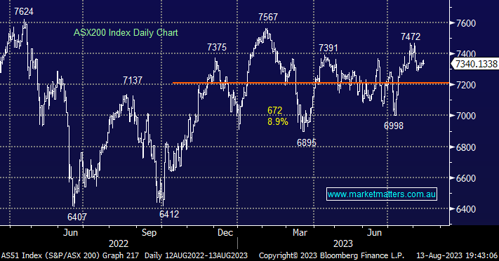 The ASX200 ended last week down -0.3% with the miners weighing on the index i.e. IGO Ltd (IGO) -4.9%, Mineral Resources (MIN) -2.5%, South32 (S32) -2.3%, and Fortescue Metals (FMG) -1.8%. Weakness in the rate-sensitive Tech and Real Estate Sectors also dampened sentiment as markets started to embrace a “Goldilocks” outcome for central banks i.e. inflation reined under control while a strong labour market helps the underlying economies remain firm – a very different story to the one unfolding in China.