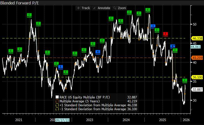 We have had Ferrari on our hitlist for the International Equities Portfolio for some time, and after a recent pullback, we are now contemplating adding RACE US to the portfolio. Ferrari is now trading on FY26 Est earnings of 33x, down from over 50x in 2025, and while the valuation still looks full relative to the broader market (and competitors), we think it can justify its premium through exceptional pricing power, strong order-book visibility and a margin profile that most global luxury peers can only envy.