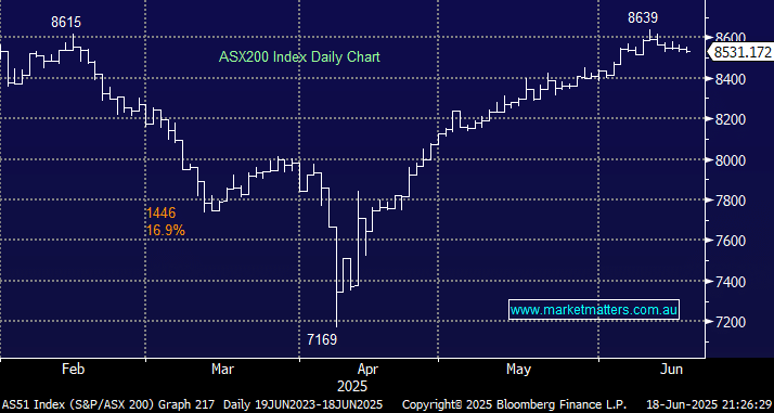 Wednesday saw the ASX200 close down 0.1% after rotating in another tight 0.4% range as the market remains in its “Middle East Conflict” holding pattern. The losers slightly beat the winners, with only two stocks moving by over 5%, illustrating the lacklustre nature of the day. At the sector level, weakness in the resources sector more than offset gains in tech, which we will examine later today. The Israel-Iran conflict has understandably raised risk premiums, which is why global equity markets have dipped. However, in our opinion, the 1.2% pullback by the ASX200 doesn’t feel sufficient considering what could unfold over the coming week(s).