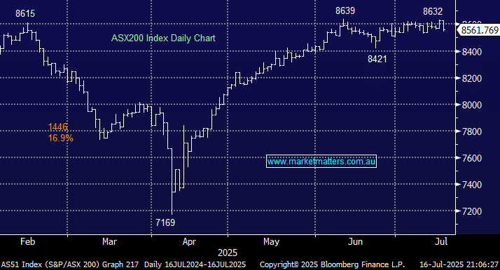 The ASX200 took a 0.8% hit on Wednesday, its worst session since early May, with over 65% of the main board retreating. Rising long-term bond yields and ongoing uncertainty around tariffs proved too much for a market striving to post new highs. The local market has now spent more than a month rotating between 8400 and 8600 and we continue to believe there’s a good chance of a test/break of the lower end of the trading range as we head into seasonally weak August and September – remember over the last decade these two months have delivered an average decline of more than 3%.