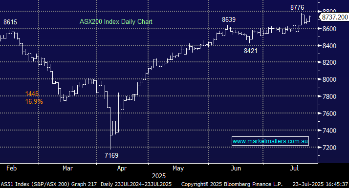 Overseas markets were strong overnight after the US reached a trade agreement with Japan, and reports crossed the wires that the EU and the US are progressing toward an agreement that would set a 15% tariff for most products. In Europe, the EURO STOXX 50 closed up +1% and the UK FTSE +0.4%. In the US, the Russell 2000 small-cap index led the line, gaining +1.5% while the S&P 500 advanced +0.8% posting another all-time high.