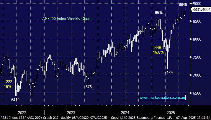 On the sector level, concerns/uncertainty around US tariffs weighed on the healthcare sector, sending it down 1.2%. In comparison, rate-sensitive names continued to outperform ahead of next week’s widely expected 0.25% cut by the RBA –  futures markets are currently pricing more chance of a 0.5% cut than no cut, albeit just. The market feels extended and tired as we enter the seasonally weak August and September, but for now, the bullish trend is unwavering, regardless of the news that has crossed our screens.