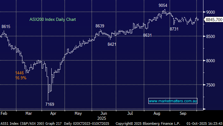 After a choppy session, the ASX200 closed slightly lower on the first day of October, with BHP Group (BHP) shaving 17 points off the index, which ultimately slipped just three points. The market seesawed through the day as investors weighed reports of a halt to BHP’s China-bound iron ore shipments alongside concerns over a potential U.S. government shutdown. Earlier this year, traders coined the acronym TACO (Trump Always Chickens Out) to capture how markets dismissed the threat of tariffs. In much the same way, today’s price action suggests investors expect the government shutdown to resolve without meaningful disruption to equities, consistent with past episodes.