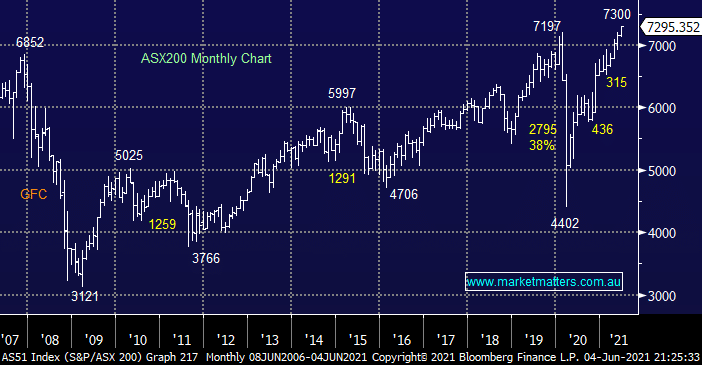 This morning the ASX200 appears poised to again test the 7300 area, if we assume the local index has already seen its low for June and the last couple of months have set the benchmark for the current breakout by Australian stocks investors should expect to see a test of 7400 in the coming weeks, a move that shouldn’t be hard to comprehend as the banks maintain their bullish charge, the average gain of the “Big 4” in 2021 is already over 28%, and that’s before we even consider their attractive dividends.