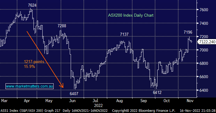 The ASX200 slipped for a 2nd consecutive day on Tuesday failing to embrace decent gains on Wall Street in the process, the banks were the biggest drag on the index with heavyweight Commonwealth Bank (CBA) dropping -1.8% although the broad market was weaker with almost 60% of the main board closing down on the day. The moves by CBA over the last 48 hours sum up the choppy nature of the current market, it advanced $1.38 on Tuesday before falling $1.90 on Wednesday i.e. it delivered a strong quarterly result on Tuesday but after surging +19.8% since July it simply feels tired on the upside.
