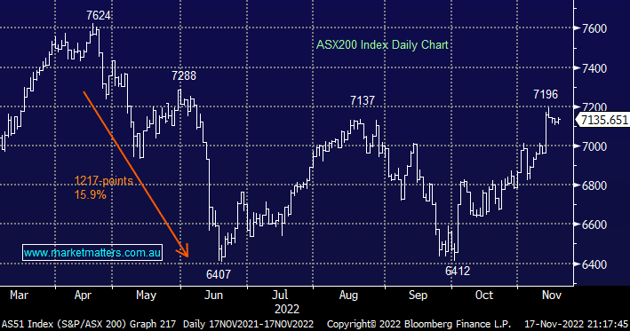 The ASX200 rallied +0.2% on Thursday with over 70% of the main board advancing, unfortunately, weakness across the influential resources stocks restrained a generally enthusiastic market e.g. Woodside Energy (WDS) -2.2%, BHP Group (BHP) -1.5%, Sandfire Resources (SFR) -3% and South32 (S32) -5.2%. It’s a touch boring but the story remains the same as the index starts to establish a small trading range between 7100 and 7200. On the stock and sector levels, it’s pretty quiet as December approaches fast, perhaps after a tough year so far fund managers are considering shutting up shop early with ~7100 feeling pretty good compared to early October.