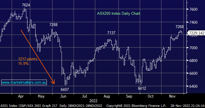 The ASX200 slipped -0.4% on Monday with weakness in the influential banks and resources stocks dragging the market lower e.g. Commonwealth Bank (CBA) and BHP Group (BHP) both fell -0.7%. The sentiment deteriorated throughout the day with US futures falling in tandem with general selling towards China as protests around Xi Jinping’s Covid-zero policies gathered momentum e.g. the Hang Seng -1.6%. To put things in perspective the state media are even censoring the soccer World Cup to avoid showing spectators not wearing masks, and the knock-on impact of the civil unrest is being felt across a number of financial markets.