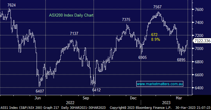 US stocks rallied overnight sending the S&P500 up +0.5% as traders digested the latest jobs data as their attention moved on from concerns around the Banking Sector following the unnerving failures. The US 10-year yield slipped back towards the 3.5% level as the idea of peak rates gathers momentum. The SPI Futures are pointing to the ASX200 opening up over 0.5% this morning, back above 7150 helped by a +1.7% advance by BHP.