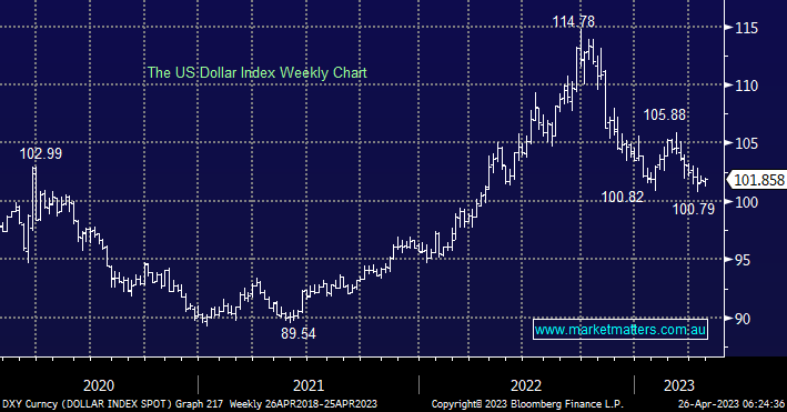 The last few weeks have seen the $US hold its 2023 low and threaten to recover some of its 12% decline since last September which is indeed MM’s preferred scenario over the coming months. A rally in the Greenback has some significant read-throughs for both the overall market, and more importantly for a number of specific sectors, a couple of examples of which have already started to shine through in the commodities space: