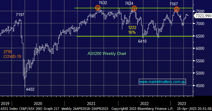 The ASX200 has looked tired over the last fortnight after its strong rally since late March and especially from October’22, while this shouldn’t scare the bulls we must remain cognisant of the local markets’ recent affinity to trade between 6500 and 7500 which would make it far closer to a sell than a buy.