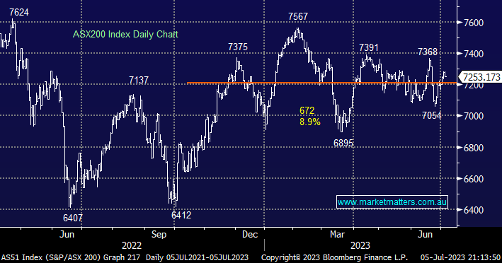 The ASX200 failed to add to Tuesday’s euphoric gains following the RBA’s pause, the index gave back the vast majority of the previous day’s gains with over 60% of the main board closing lower. The financials weighed on the market with the “Big Four” ending down an average of -0.7% while the heavyweight major miners and CSL offered little hope to the bulls. As we keep saying the action is unfolding under the hood as opposed to on the index level, all we need to do at MM is pick the correct stocks, therein lieth the challenge!