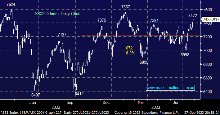 Thursday saw the ASX200 soar to levels not enjoyed since mid-February, for all the doom & gloom that pundits have been pedalling through 2023 the local index is now only 2.2% below its all-time high. The recent rally has been fuelled by hopes that we may see a pause/end to interest rate hikes by the RBA. On the result/news front yesterday the impact was largely negative with falls from the likes of Macquarie (MQG), RIO Tinto (RIO) and the coal sector making the markets broad-based +0.7% gain all the more impressive.