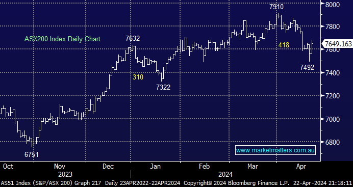 The ASX200 bounced over 1% on Monday, with gains by 10 out of 11 sectors and 85% of the main board, but it was the heavyweight end of town that dragged the market back towards 7650, e.g. CSL Ltd (CSL) +2.2%, BHP Group (BHP) +1.8%, and Commonwealth Bank (CBA) +0.9%. The market was up over 100 points early in the session, but another “sell recommendation” on the banks weighed on the sector and, by definition, the index, i.e. the “Big Four Banks”, plus Macquarie Group (MQG) represent 22.5% of the ASX200 by market cap. – more on this later. The ASX is not out of the woods, but it has already retraced 40% of April’s pullback in just two sessions.