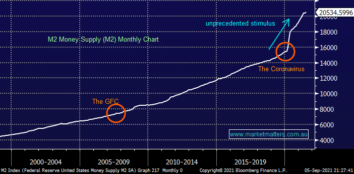 Unprecedented liquidity / “free money” has driven asset prices through the roof including houses, art, cars and equities and while the US M2 Money Supply may have levelled off in 2021 as we’ve recently witnessed in NSW & Victoria governments aren’t going to be slow to press the stimulus button if / when outbreaks threaten economic recovery i.e. lockdowns.