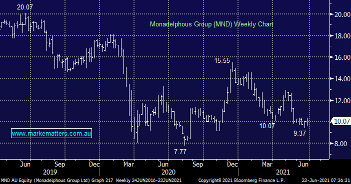 As we covered earlier in the week MM is considering taking a more than 20% profit from our 3% holding in HUB24 (HUB), we are contemplating using the proceeds to increase our Monadelphous (MND) holding from 3% to 5% while taking our cash position marginally higher to 14%.