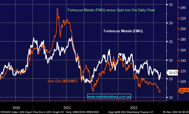 At the end of October, Fortescue reported a good operational update with solid production setting up the company for another record year, however, two headwinds were obvious and these need to ease for the FMG share price to rally. Iron Ore prices have been weak as Chinese lockdowns continue, reducing the demand for Iron Ore with prices last week hitting ~US78/tonne down from $US160/tonne in April, while cost pressures are also obvious throughout their operations – costs up 16% YoY thanks to higher expenditure on diesel and labour. There are always headwinds to discuss when share prices are near 52-week lows and FMG is no exception, however, what comes next is important. Many higher-cost Iron Ore producers are losing money at current prices which is unsustainable over longer periods of time, while Chinese lockdowns will end (at some point). As the $US eases & China moves closer to re-opening and some stimulus to boost tepid growth, Iron Ore is starting to look interesting again.