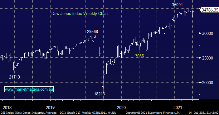 No real change as the large tech names helped push the likes of the NASDAQ and S&P500 to new highs while the old stalwart the Dow struggles to follow suit but it’s now within striking distance and our optimum upside target is only a few good days away. My “Gut Feel” is another ~8% pullback is looming on the horizon after such highs but we still feel the prudent approach is to be prepared to buy such a move as opposed to moving to cash as so many have done to their detriment at different times since early 2020.