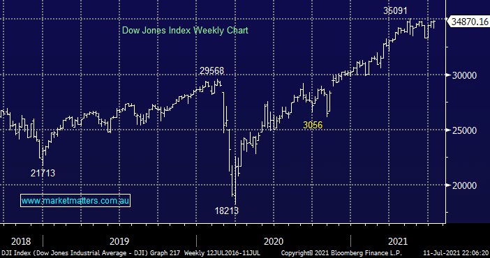 Again no real change as the large tech names continue to push the likes of the NASDAQ and S&P500 to new all-time highs while the old stalwart the Dow struggles to follow suit but it’s now less than 1% away, our optimum upside target is now only a couple of good days away. My “Gut Feel” is still another ~8% pullback is looming on the horizon but there are clearly no sell signals permeating through at present and the buying of dips is clearly in play.