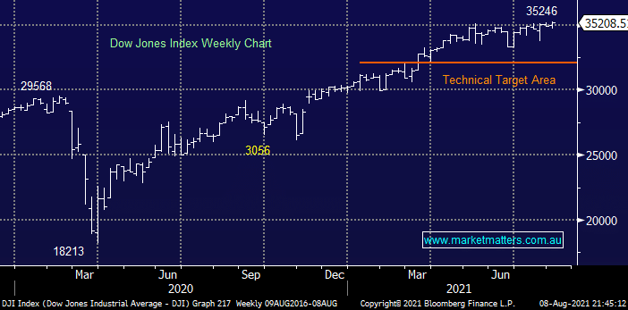 We’ve looked at the Dow today following Friday nights strong performance by the value end of town, this more parochial index is still trading close to its mid-May levels but after last week’s breakout to new all-time highs our ~36,000 target is now only 2-3% away and feels like just a matter of time. Subscribers should remember that the ASX is more corelated to the Dow than the likes of the S&P500 and NASDAQ due to our markets large weighting towards the banks and resources hence the bears are likely to endure a tough August.