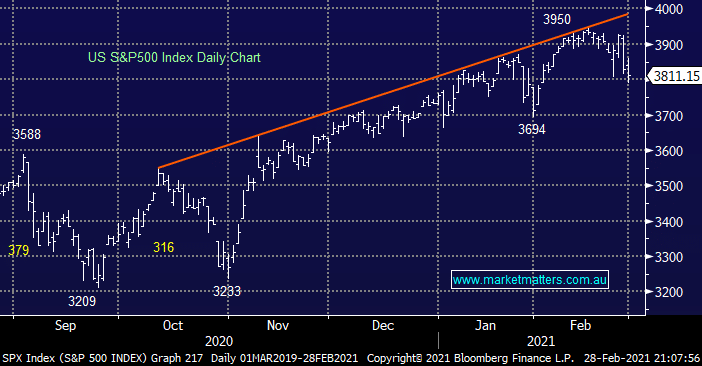 The closely watched US S&P500 continues to struggle on the upside whenever it tests the overhead resistance line illustrated below, another attempt in March is likely to see MM reduce our market exposure in line with our volatile outlook for 2021. The S&P500 is made up of ~25% big tech which has struggled noticeably as bond yields accelerate higher. We know from the Bank of America Fund Mangers Survey that the consensus view for 2021 was rising bond yields but the nature of the acceleration higher has clearly made investors very uncomfortable e.g. Australian 10-year bonds have more than doubled already this year and its only the start of March!
