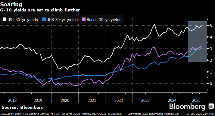 - However, the biggest drama is arguably playing out in Tokyo, where the yield on Japan’s 30-year bonds has surged over the past week and is now at a two-month high, thanks to concerns that government spending will increase following an upper house election on July 20.