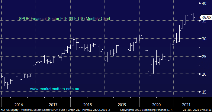 - We like 2 ETF’s which offer increased exposure to the reflation trade, firstly the $US38bn US financials XLF ETF, yet again around 4% lower (we will provide an ASX listed alternative if we press the button here).