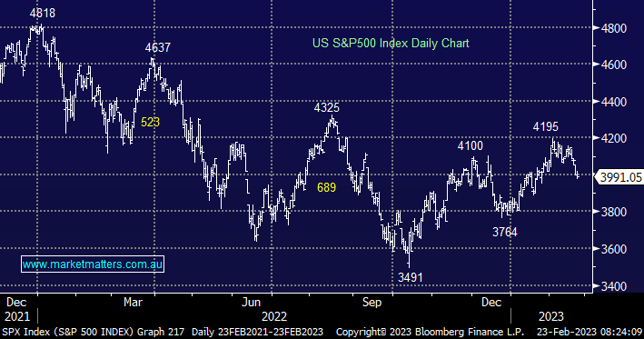 US stocks closed mixed overnight with the Dow falling -0.3% while the NASDAQ edged higher +0.1%, concerns that rates will stay higher for longer continue to weigh on investor sentiment – several officials said an “insufficiently restrictive” policy could stall the recent progress of tempering inflation. The latest minutes suggested the Fed is now prepared to hike rates to above the 5.1% rate forecast in December i.e. its sounds like they feel they’re losing the battle!