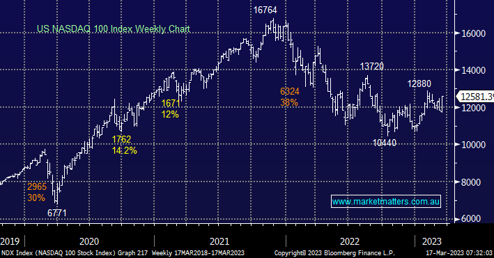 US stocks experienced another volatile session overnight as a rate hike by the ECB sent bond yields higher, the US 2 years closed back above 4.15% but ongoing rescue packages supported equities i.e. the “Fed Put” is getting busier by the day. The Dow rallied +370 points but the tech-heavy NASDAQ again led the market closing up +2.7% even as bets increased that the Fed would hike rates again next week.