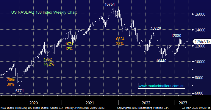 US stocks experienced another volatile session overnight but overall we felt they looked good until Janet Yellen’s comments which make zero sense unless she’s seeing more trouble on the horizon for the embattled banking sector which in itself is a contradiction of Jerome Powell. The tech-heavy NASDAQ posted a fresh 7-month high early in the session even as the Fed continued to hike rates suggesting the “bad news”  was fully built into stocks but they couldn’t handle the negativity delivered by Yellen. Our view hasn’t waivered through 2023 as we look for this growth index to rally towards the 13,500 area, or another 6% higher.
