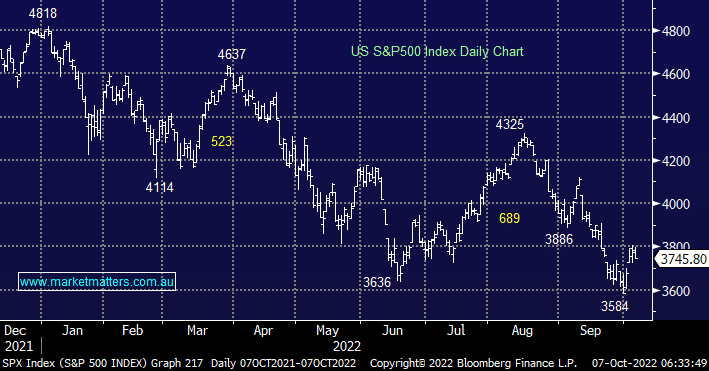 Overnight we saw US stocks struggle following ongoing hawkish comments from the Fed and likely trepidation ahead of tonight’s important US unemployment data i.e. US Non-Farm Payrolls which captures ~80% of their workforce. We still wouldn’t rule out another foray towards 3550 by the S&P500 but following its 26% correction this year we believe the risk /reward has swung around in favour of the buyers.