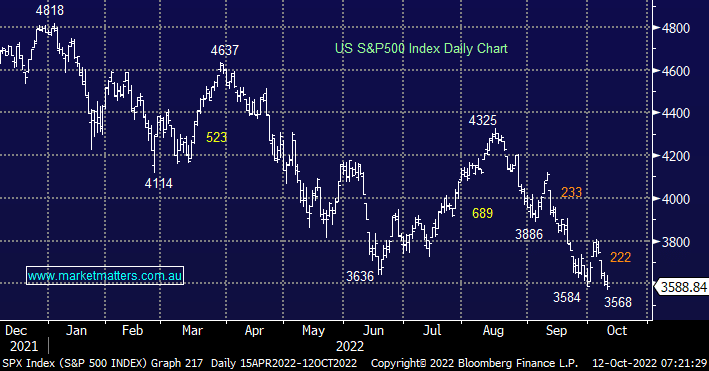 US indices again made fresh lows for the year overnight after failing to hold onto early gains in the session, China facing names fared the worst on heightening COVID and growth fears. Equities clearly don’t look good today as they post fresh 2022 lows but interestingly the market internals are improving e.g. we have a reduced number of stocks making new lows (improved market breadth) and a spike in the put/call ratio to multi-year highs both being encouraging leading indicators to support our view that a decent low is close at hand.
