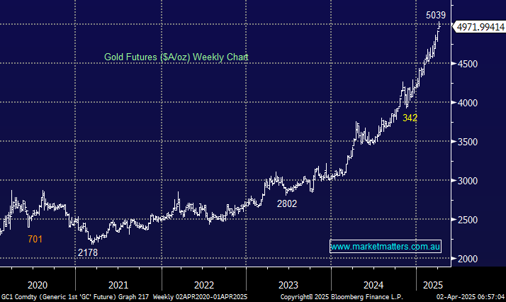 Gold popped above $A5,000/oz in the last 24 hours; it feels like only yesterday we were considering the precious metal as it approached $A4,000. Interestingly, after popping through the psychological $A4,000 level, the precious metals then quickly corrected 8%, a move that was reflected in more dramatic fashion on the stock level, e.g. Evolution fell 91c, or 17%.