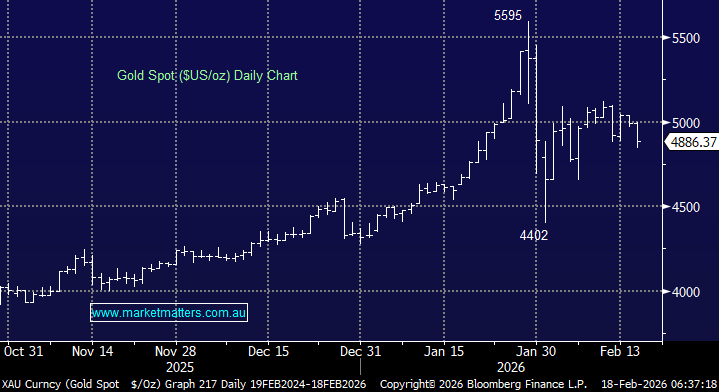 Gold fell below $US4900 in holiday thin trade overnight as the $US advanced and China remained closed for the Lunar New Year remembering the robust retail demand from China and India has supported the gold price through 2025 and early 2026. While the stock market continues to hover close to its all-time high, enthusiasm for the safety of precious metals has also waned, and last month’s high feels like a long way away at the moment.