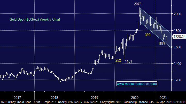 While oil looks to be putting in a major top, there are growing signs that gold is putting in a bottom and is setting up for a rally into financial year end. While it’s too early to call this move and we need to see a break up through $US1764m as confirmation, the pullback in the $US last week and consolidation in yields despite net positive news flow are both bullish indicators for gold, after what’s clearly been a tough period for the precious metal. To view a bullish thesis on gold, click here to watch a recent video update from gold bull Peter O’Connor.