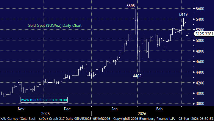 Gold bounced +0.8% overnight but closed well off its highs as sellers into strength reemerged in precious metals. Similarly gold miners in the US opened strongly before surrendering most of their gains to finish marginally higher. A few months oscillating around the $US5,000 area is our preferred scenario for gold, with a strong possibility of a spike down towards the $US4,200-$US4,400 area.