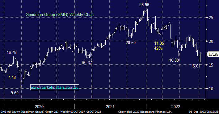 GMG has certainly experienced a year to forget so far but we still feel it remains a quality business that is offering excellent value around $17. The stock has certainly been under pressure from overall concerns towards both the Property Sector and growth stocks generally but in our opinion, the elastic band has become very stretched and a snap back is very close at hand, if not already underway.