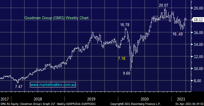 As we’ve mentioned previously the “yield play” stocks have struggled in 2021, high flying property group GMG is down -4.2% so far this year, not a dramatic move but against the positive market trend. However as the speed of ascent by bond yields has slowed the stock has found its strength, In line with our view that bond yields consolidate GMG should have the momentum to retest its all-time highs.