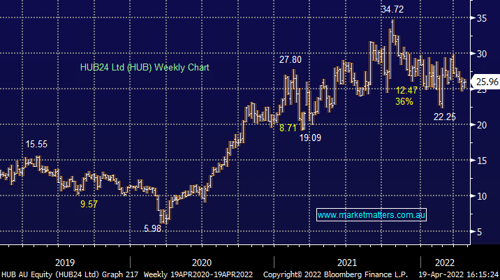 HUB +2.04%: 3Q22 update out this morning with the investment platform recording net flows of $2.6bn which was up +36% YoY. This was a better outcome than Netwealth (NWL) reported last Thursday with FUA +16% YoY. There was a lot of uncertainty during the period – global conflicts, rising rates, central banks tightening policy etc so in that context we’ve got to applaud HUB for delivering in such a challenging environment. Total funds on the platform of $51.0bn, an increase of  +43% YoY plus their non-custodial funds called PARS was +$17.3bn, up +9.7% on this time last year. We have management in tomorrow morning to run through the detail.