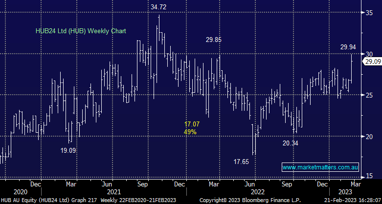 HUB +7.74%: A very strong update from investment platform provider HUB 24 today (HUB) and the stock reacted accordingly. 1H23 group revenue of $137.7m was strong and around ~10% ahead of expectations while Underlying EBITDA at the group level of $49.9m was a ~5% beat. They provided an update to Funds Under Administration (FUA) as at 17 Feb of $58.5bn which infers +$2.7bn from 31-Dec. The market is up ~2.7% which accounts for some of this, but strip this out we get net flows of ~$1.3bn which is good momentum, particularly for that time of year as most advisers are away in early Jan. The Interim dividend of 14cps FF is up +87% on 1H22 dividend. This is a very strong update from HUB, a lot better than we expected, we have management on Thursday for more detail.