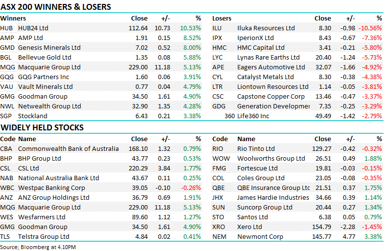 HUB +11.31%: Stormed higher today after the wealth management platform reported underlying EBITDA for the full year of $102.4m versus consensus of $99.23m, however, they also increased the dividend (18.5c v 12.5c) and announced a $50m buyback which underpinned the shares. Improved cost controls and a lower tax rate drove the beat and provided the board with confidence to repay shareholders with an increased payout for FY23. The operational leverage is starting to shine through for HUB with net profit of $38.2m up from $14.5m last year and total Funds Under Administration (FUA) hit $80.3bn, up 22% YoY.